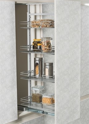 Применение: Шкаф-колонна устанавливается в кухонный шкаф и полностью выдвигается вместе с фасадом, создавая максимальный доступ ко всем вещам.